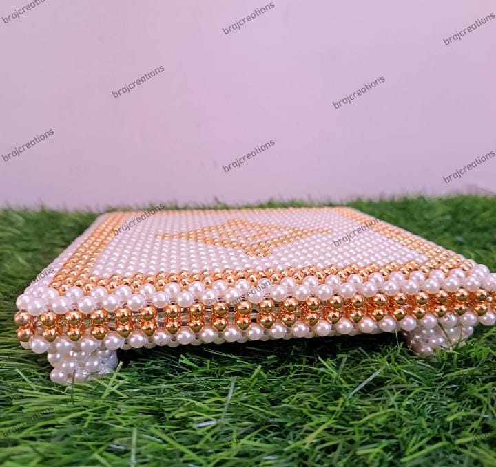 Elegant Pearl Chaunki (7 x 7 inches) for Laddu Gopal and other deity idols. Decorated with fine pearl work, it brings a divine and royal touch to your mandir. Ideal for daily puja, festivals, or gifting.