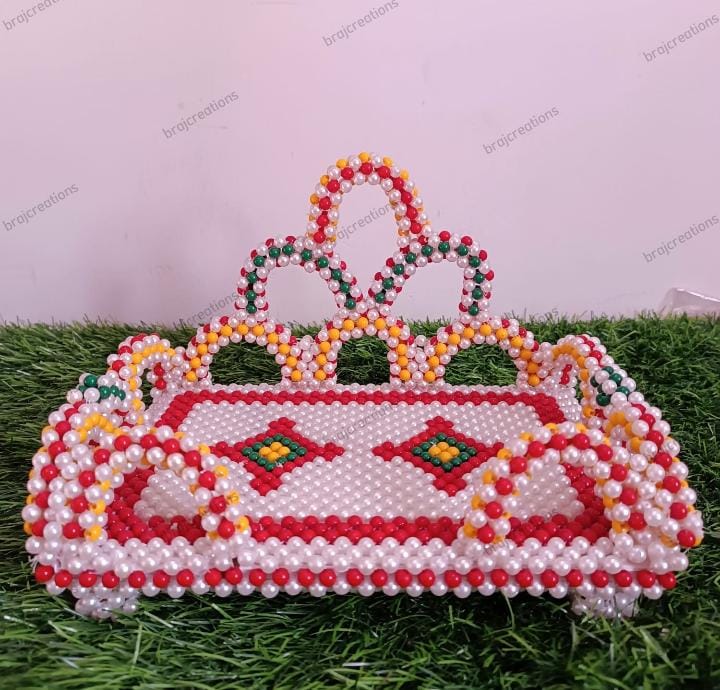 Elegant Pearl Singhasan in big size (5.5 x 8 inches) for Laddu Gopal and other deity idols. Made with beautiful pearl work and premium materials, perfect for puja, festivals, or gifting. Ideal for medium to large idols, it adds a royal touch to your mandir.