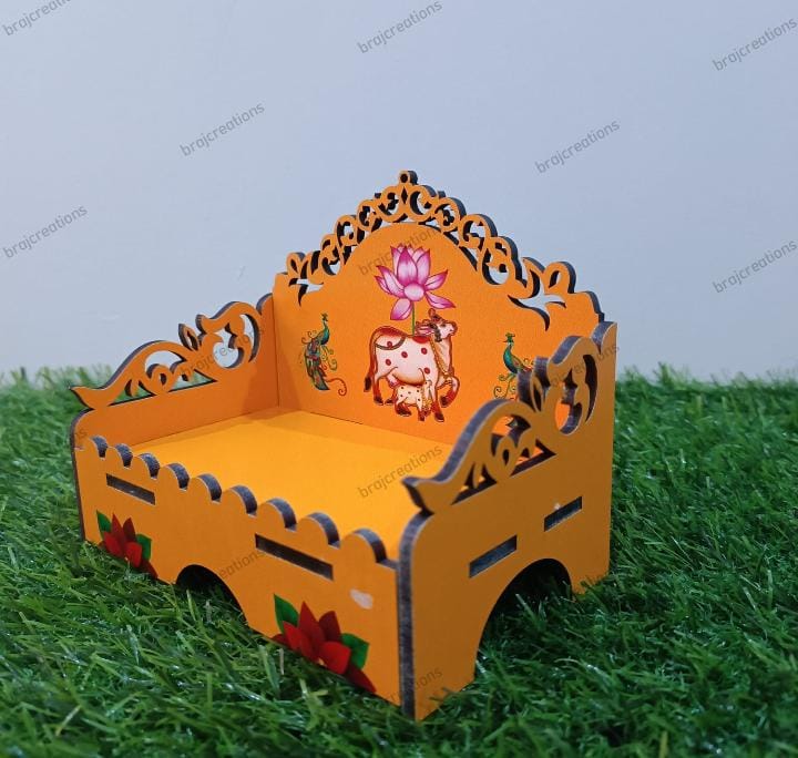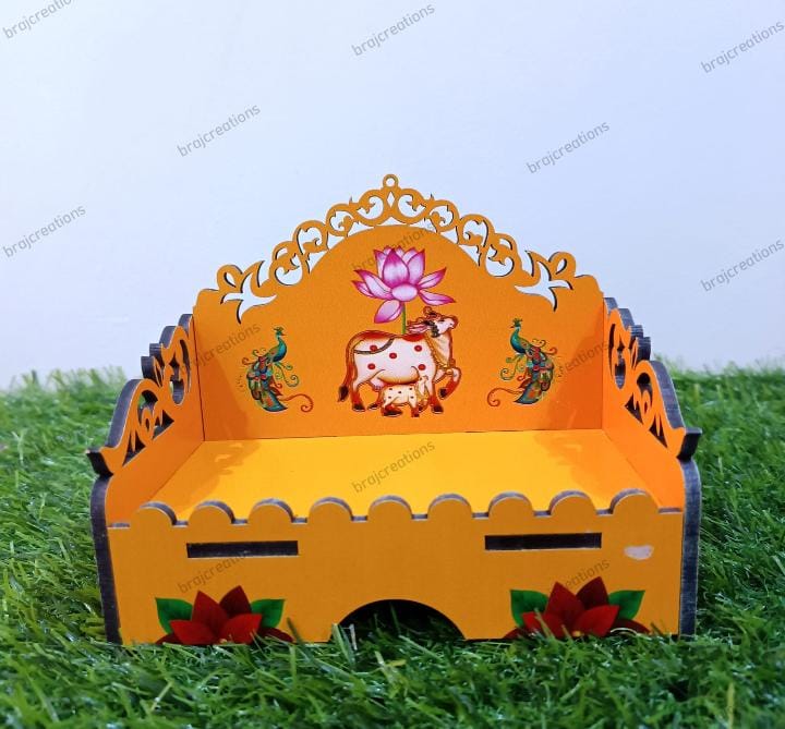 Vibrant Yellow Cow Singhasan for Laddu Gopal and other deity idols. Crafted with bright yellow colors and intricate design, it adds a cheerful and divine look to your mandir. Ideal for daily worship, festivals, or gifting.